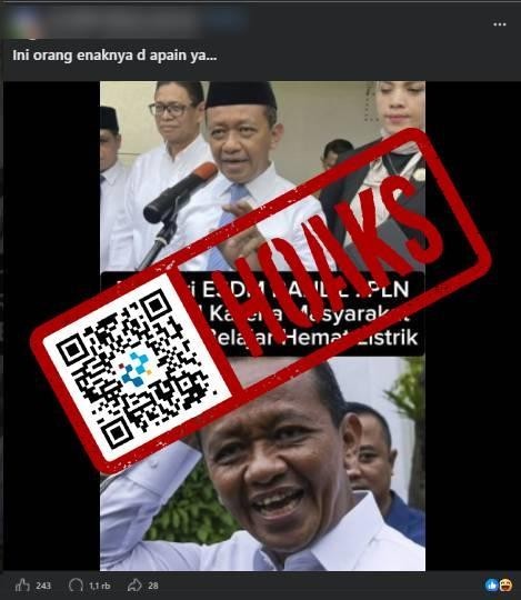 Beredar sebuah unggahan di media sosial Facebook yang mengeklaim bahwa Menteri Energi dan Sumber Daya Mineral (ESDM) Bahlil Lahadalia menyebut Perusahaan Listrk Negara (PLN) merugi karena masyarakat tidak hemat listrik.