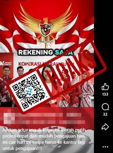 Beredar di media sosial Facebook unggahan video tentang Koperasi Merah Putih yang diklaim memberikan pinjaman tanpa bunga dengan narasi “Syarat pengajuan di Koperasi Merah Putih cukup foto KTP dan nomor rekening saja tanpa biaya admin dan bunga 0%. Jika berminat, silakan DM”.