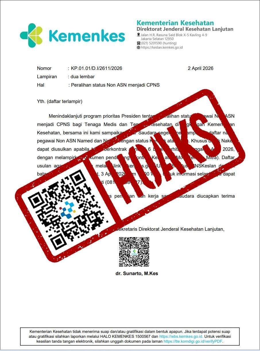 Beredar di media sosial Threads sebuah surat berisi intstruksi pendataan untuk pengalihan status pegawai non Aparatur Sipil Negara (ASN) menjadi calon pegawai Negeri Sipil (CPNS) bagi tenaga medis.