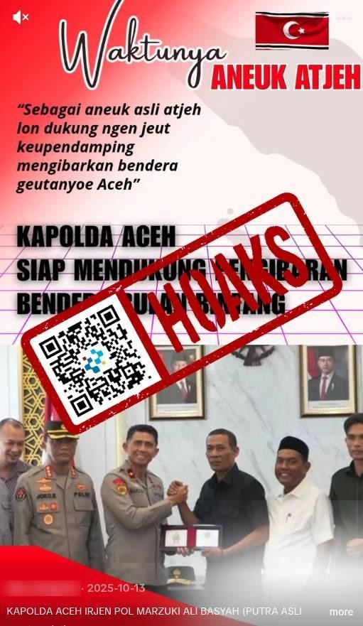 Beredar sebuah unggahan di media sosial TikTok dengan narasi yang mengeklaim Kepala Kepolisian Daerah (Kapolda) Aceh Irjen Pol Marzuki Ali Basyah siap mendukung pengibaran bendera bulan bintang atau Gerakan Aceh Merdeka.